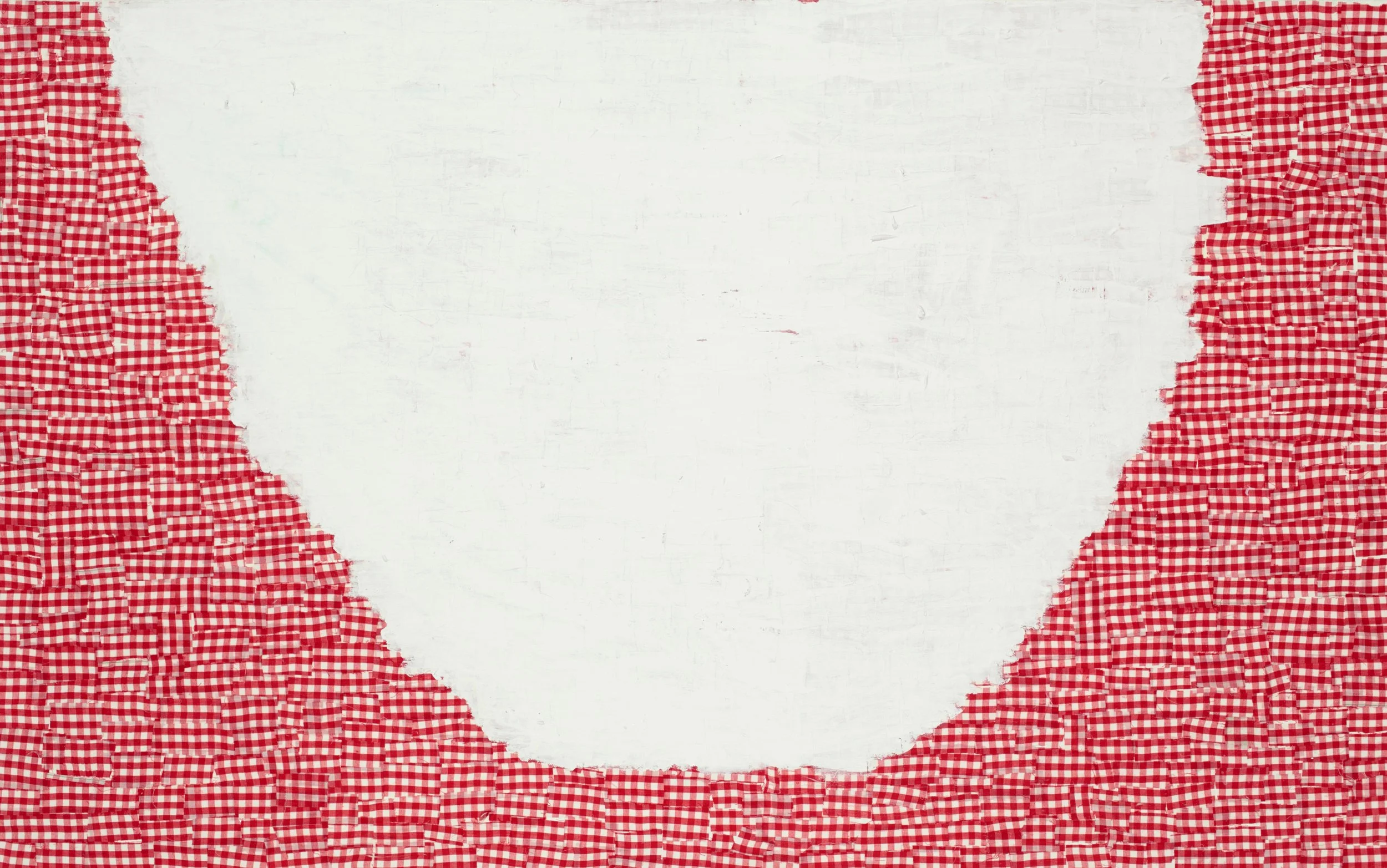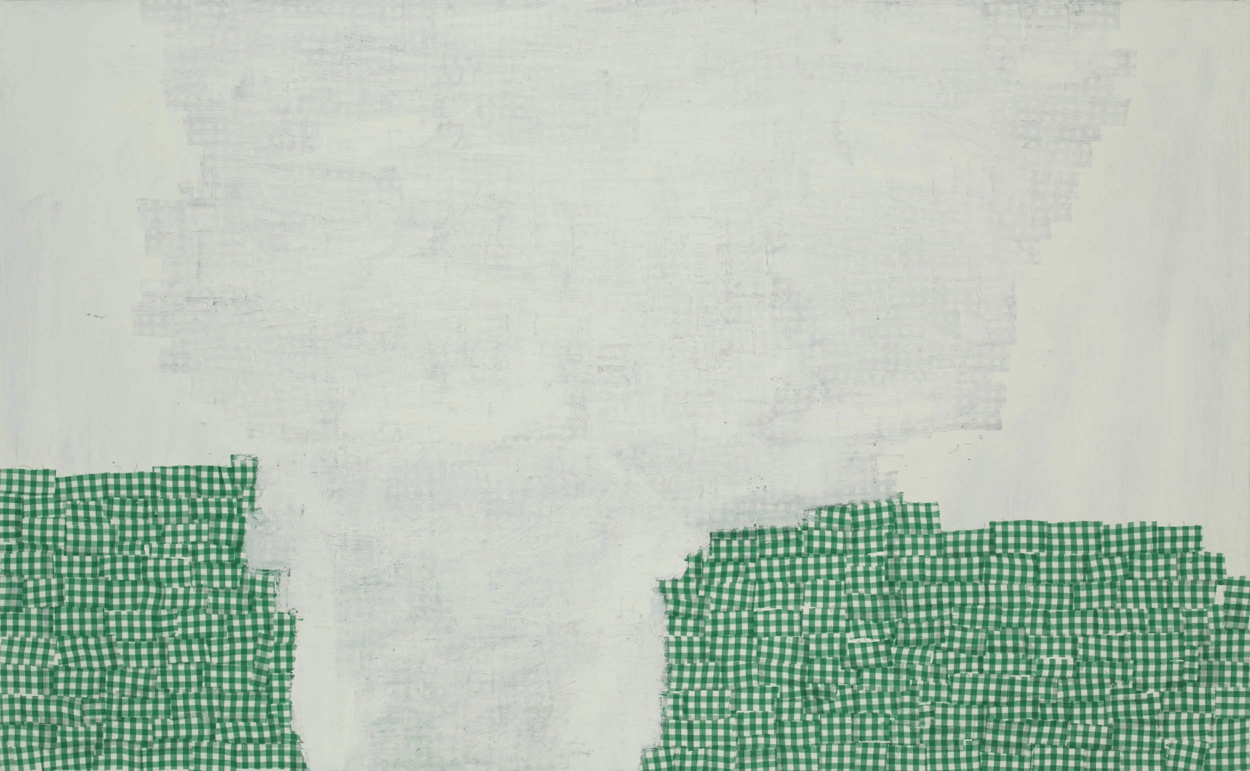 By the end of that decade and armed, I think, with both confidence and a sense of freedom, Price’s practice became even more experimental. While on a residency at Denver’s RedLine Center for Contemporary Art, he started to use pre-printed fabrics as his exclusive medium, first in works on paper and then on large canvases. Using strips of cast-off stripes and gingham, Price dug deeper into his predilections for materiality, pattern, and form.
